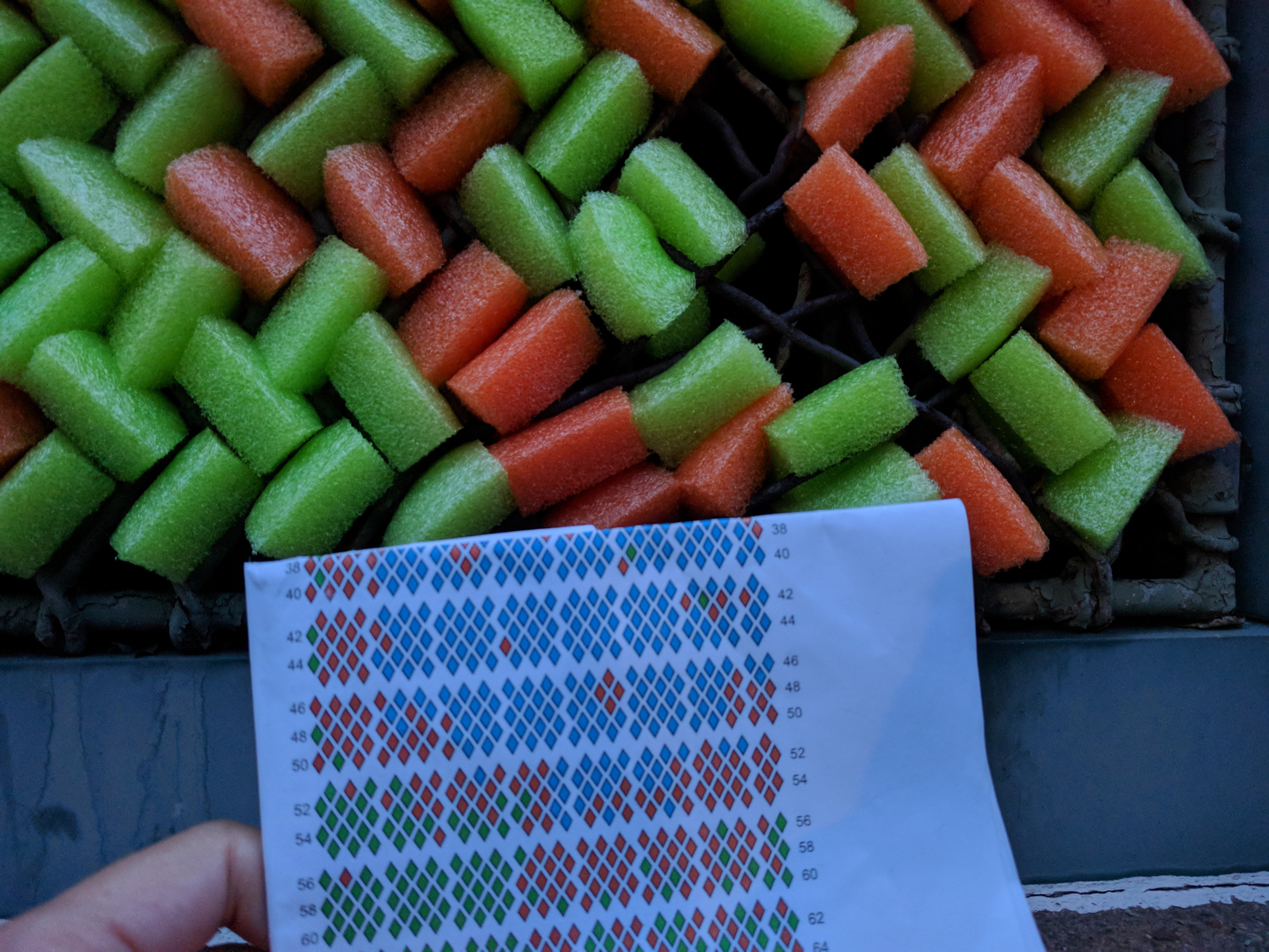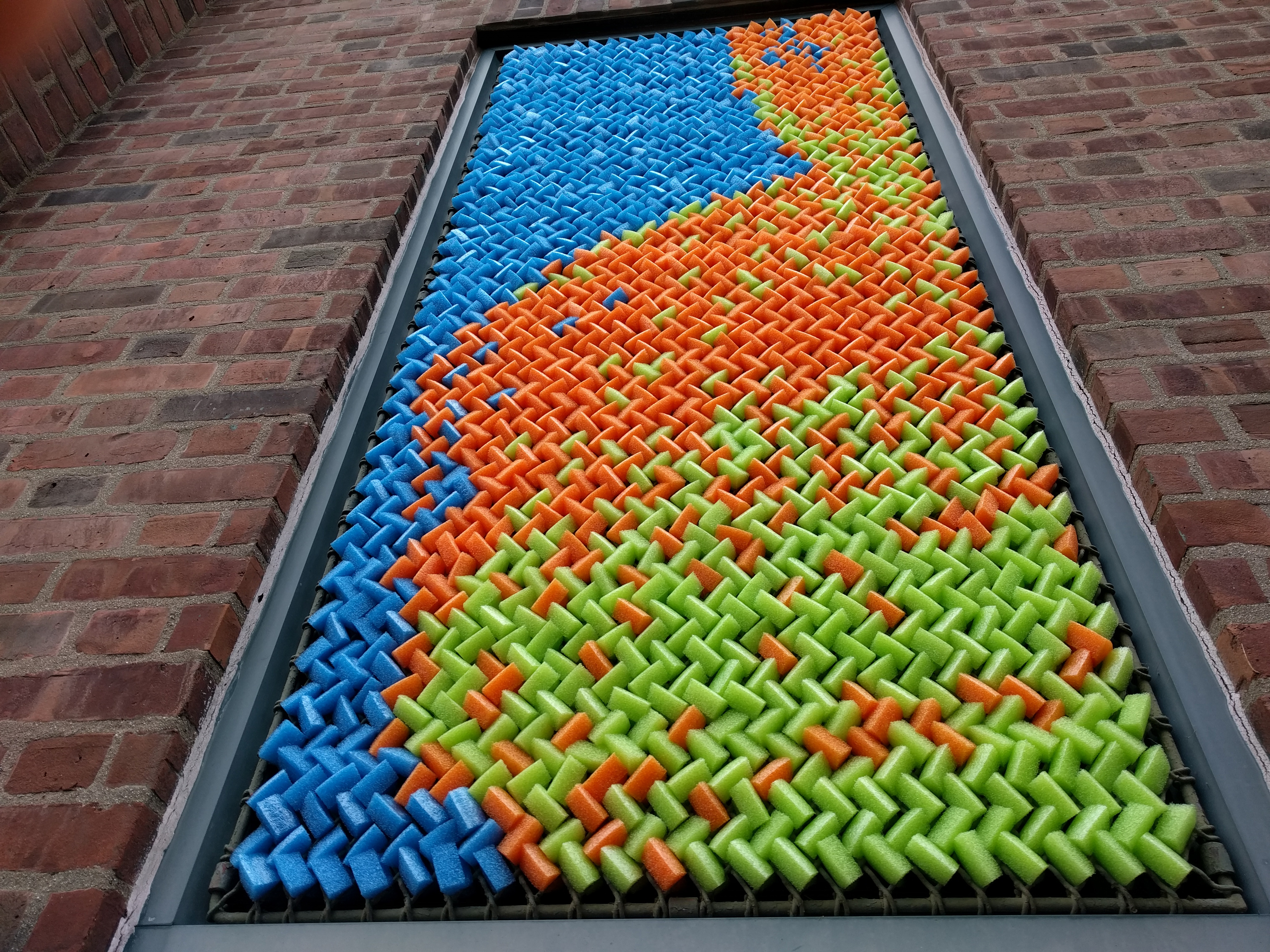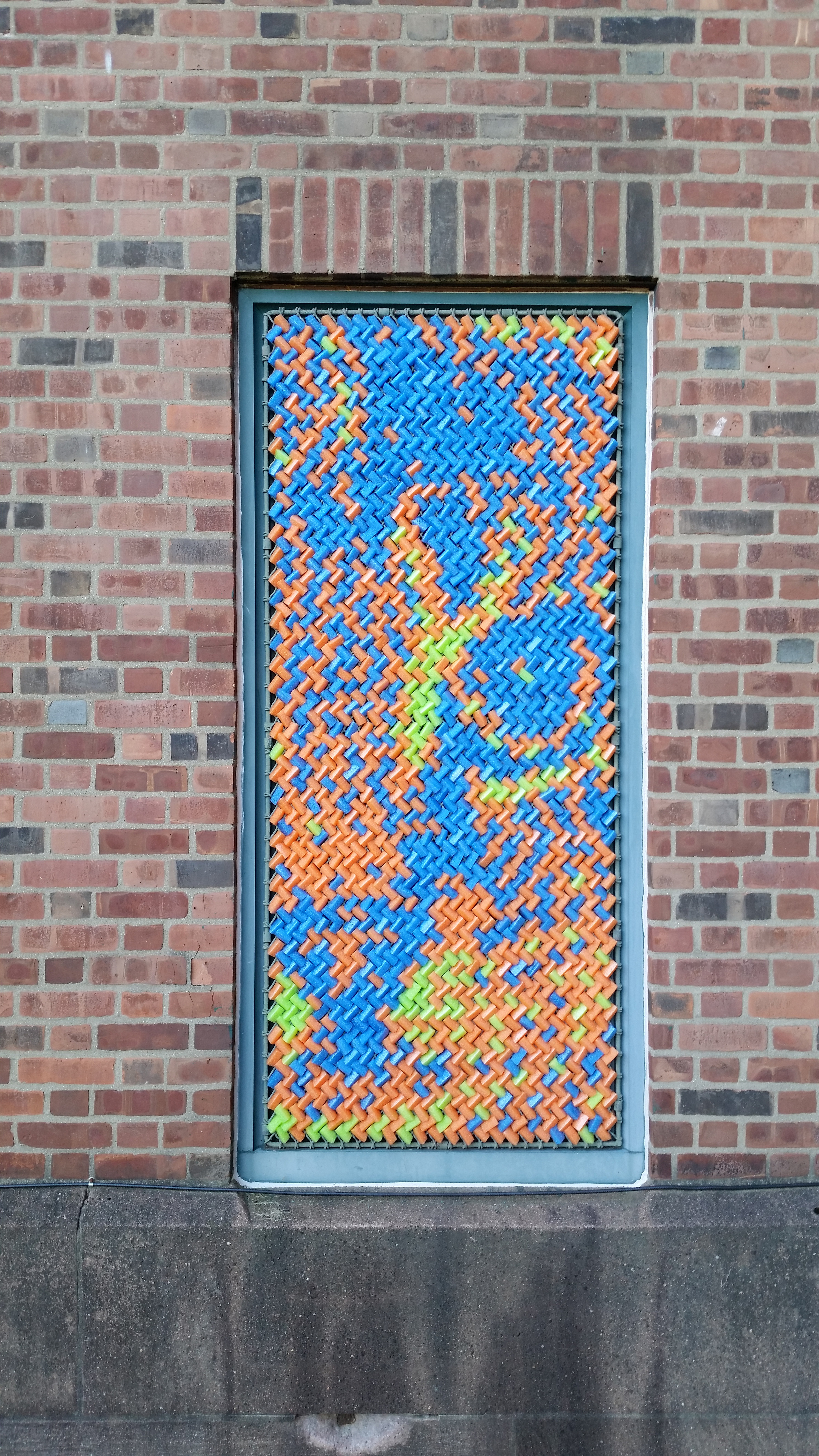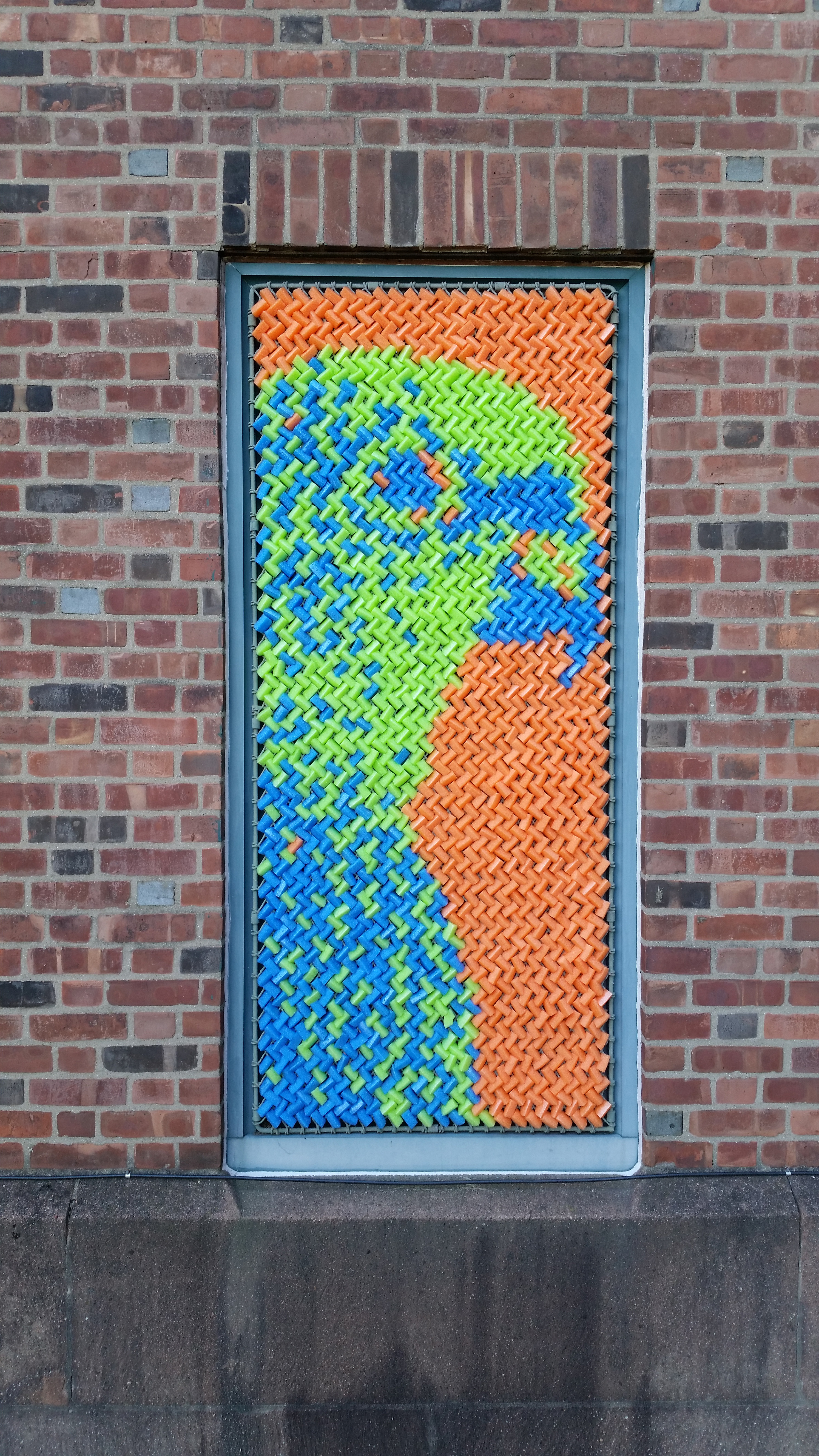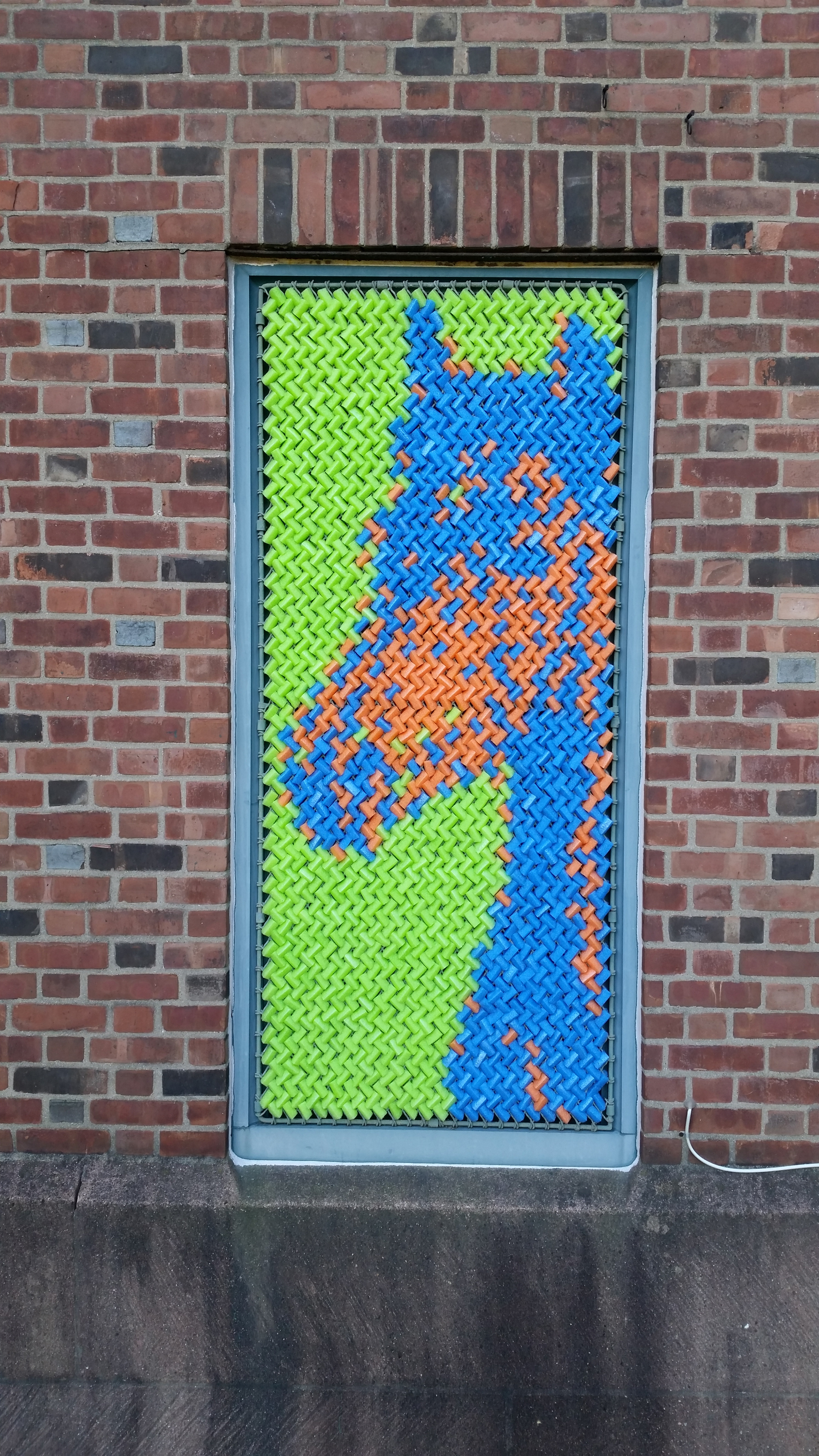 I have collaborated with my friend Dan Bernier to build public art installations out of cut up pieces of pool noodles. This strange obsession started in 2014 when we built a low-resolution portrait of Marilyn Monroe above the elevator in the coworking space called the Grove in downtown New Haven. (See this gallery for a tapestry we built in 2019 for an illuminated window display in downtown New Haven.)