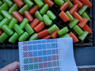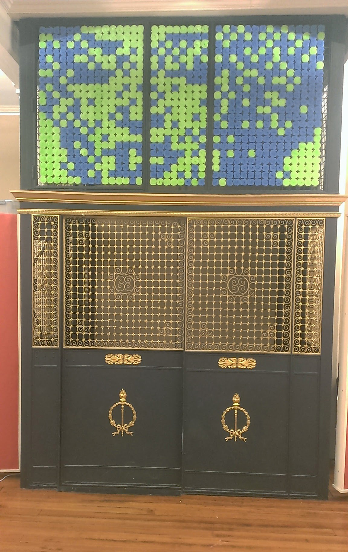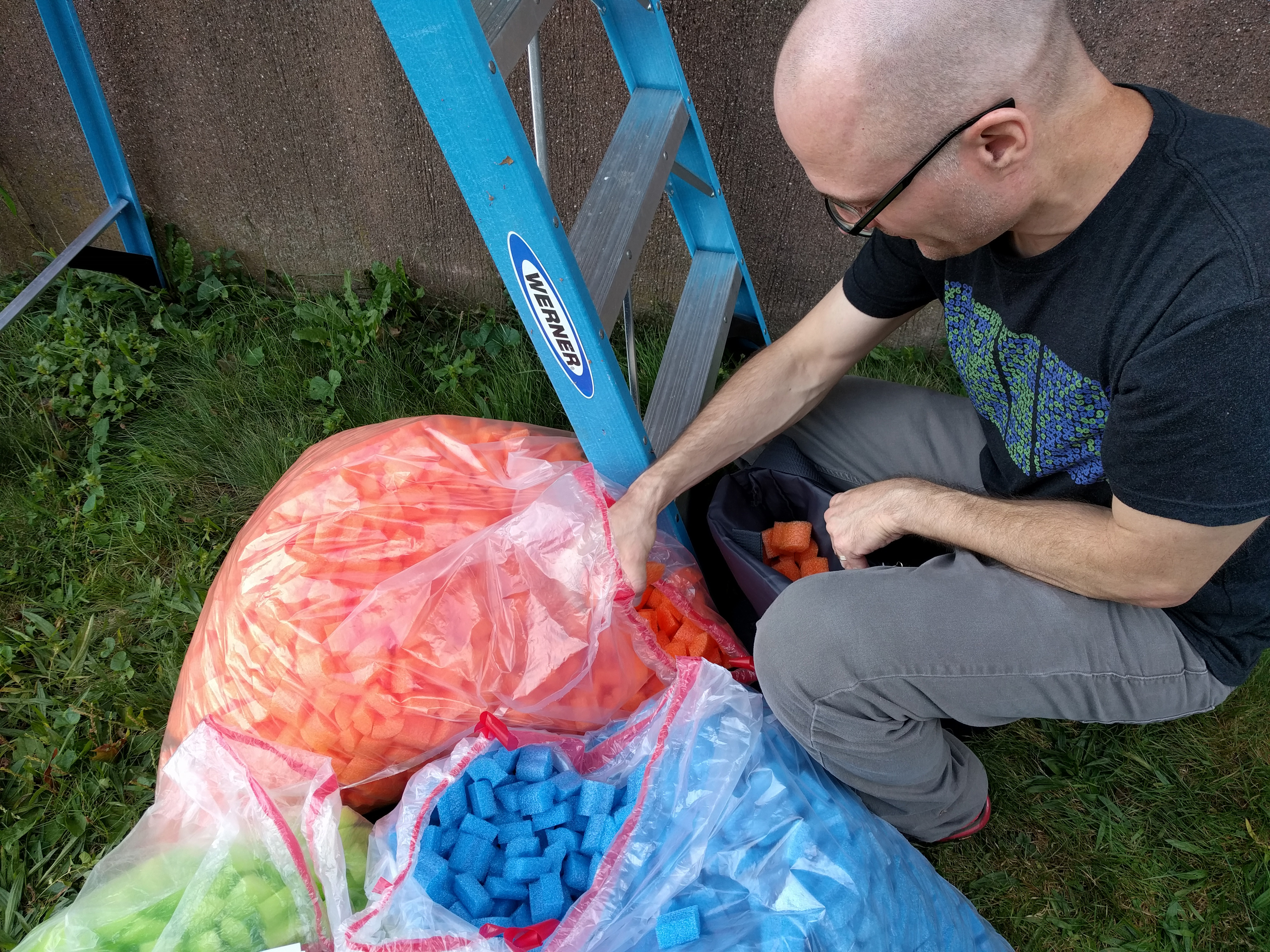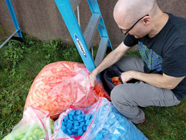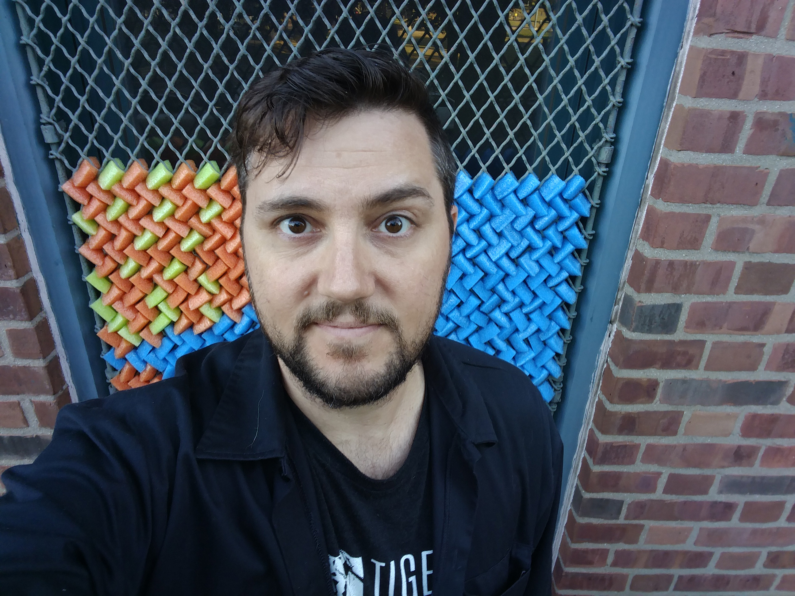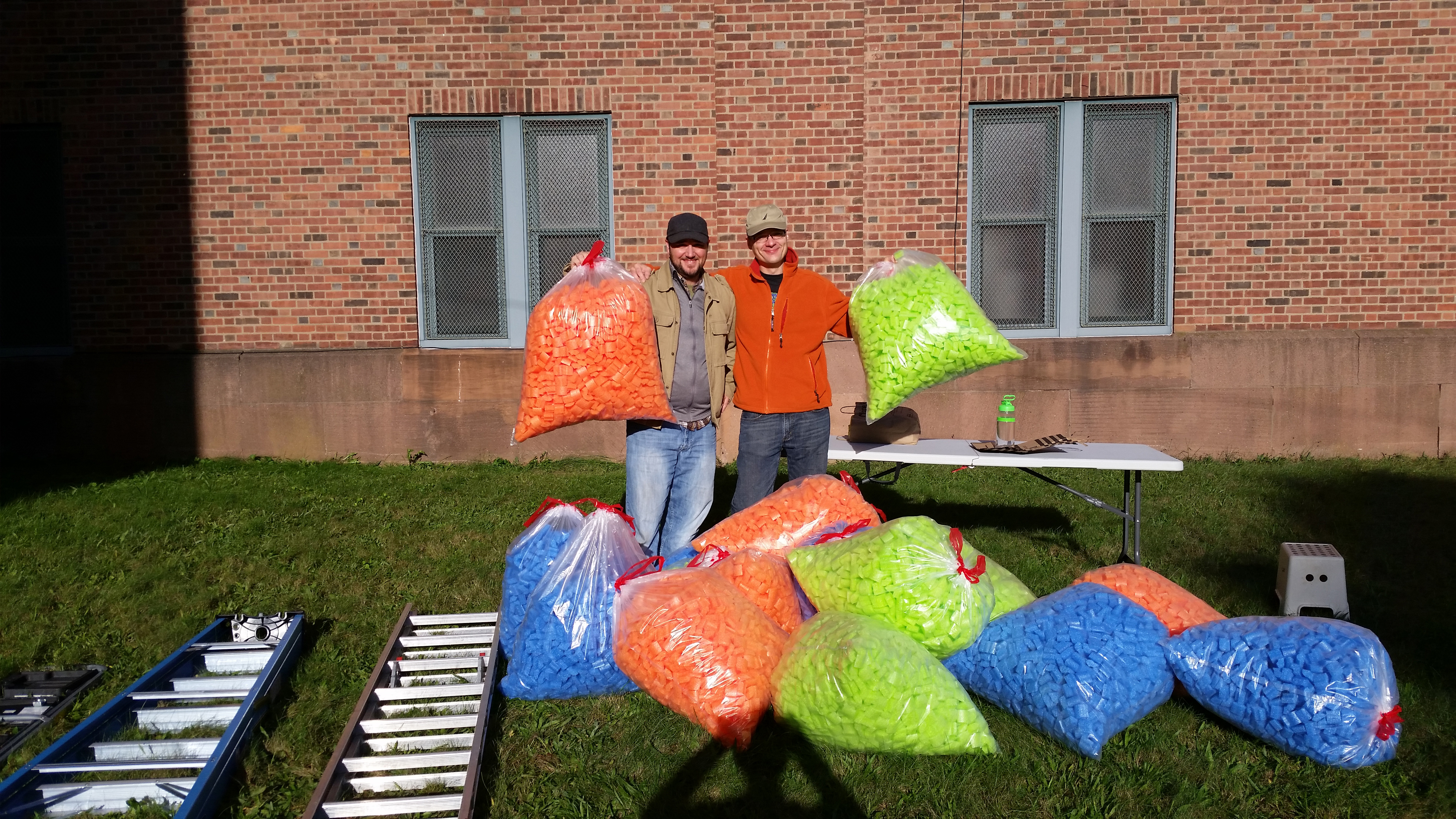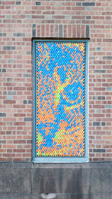 I have collaborated with my friend Dan Bernier to build public art installations out of cut up pieces of pool noodles. This strange obsession started in 2014 when we built a low-resolution portrait of Marilyn Monroe above the elevator in the coworking space called the Grove in downtown New Haven. (See this gallery for a tapestry we built in 2019 for an illuminated window display in downtown New Haven.)