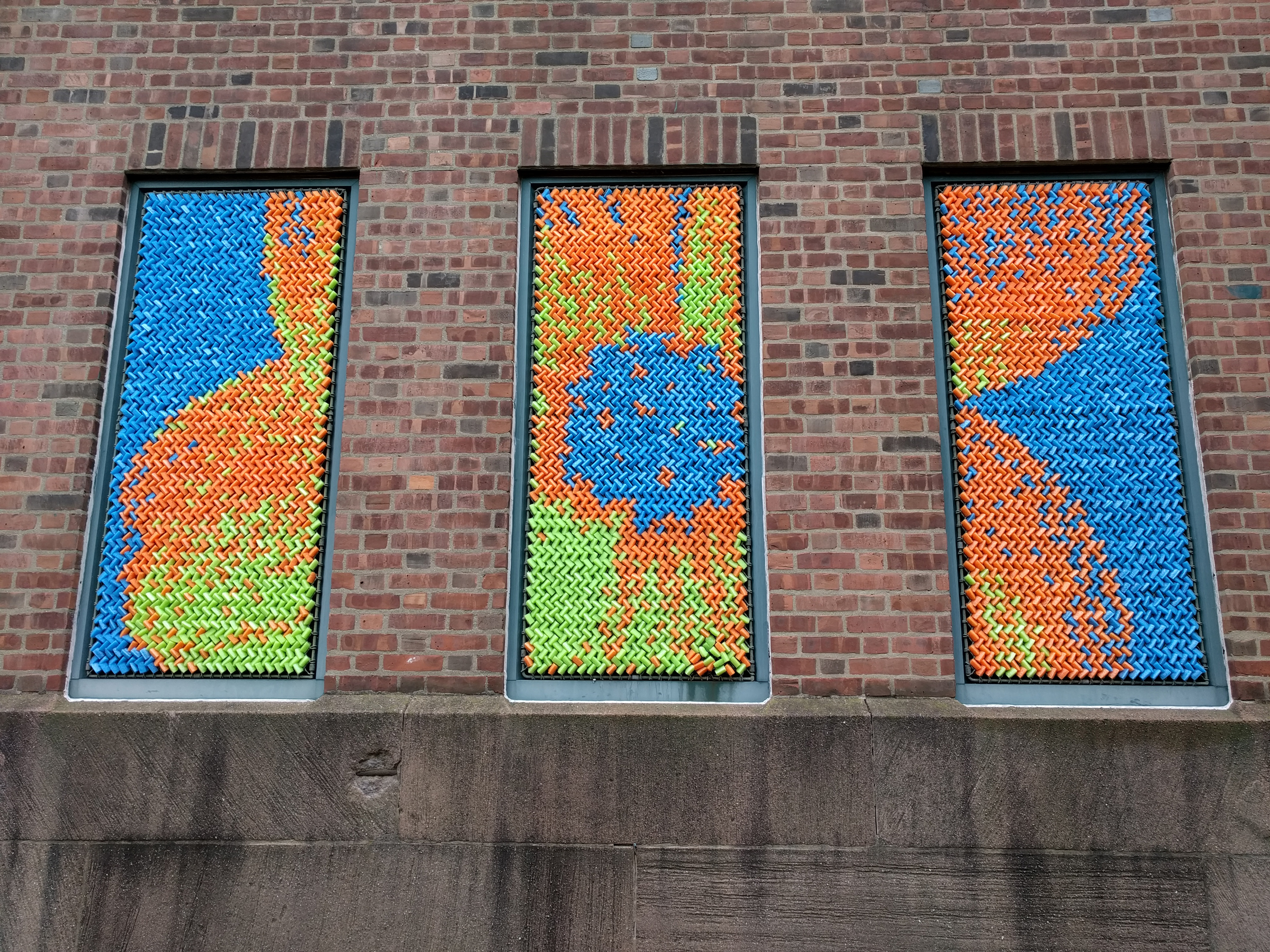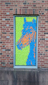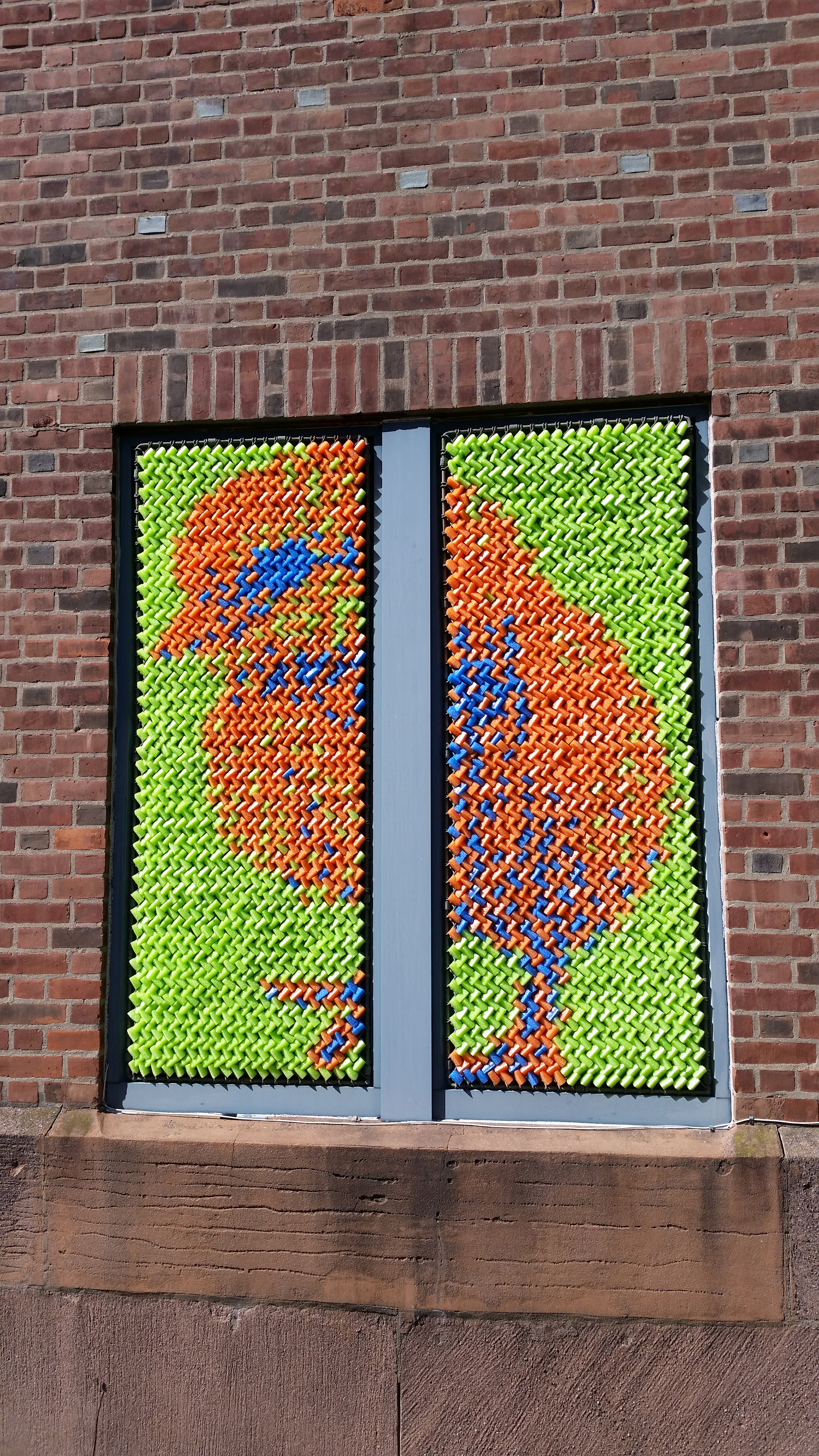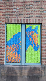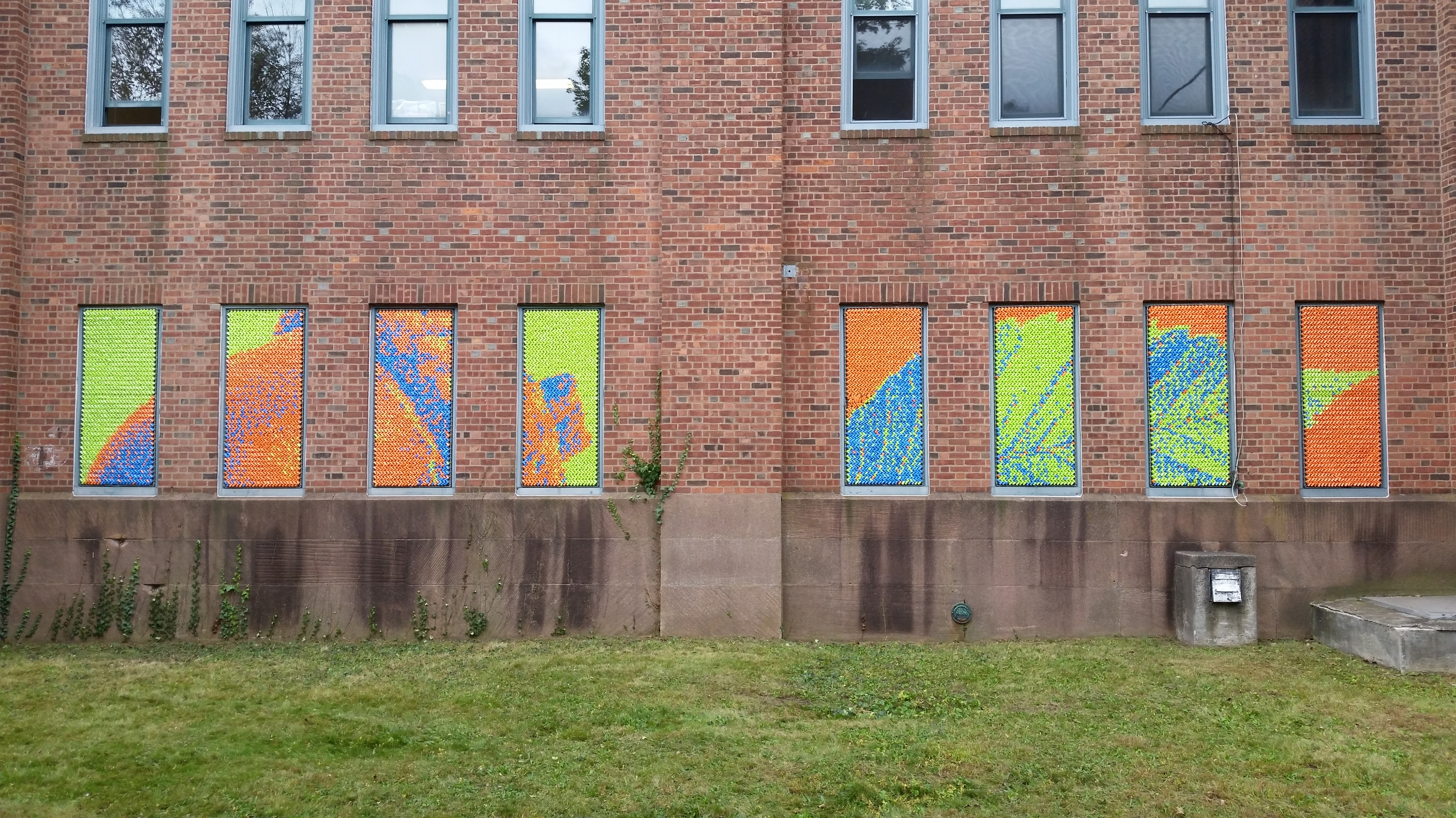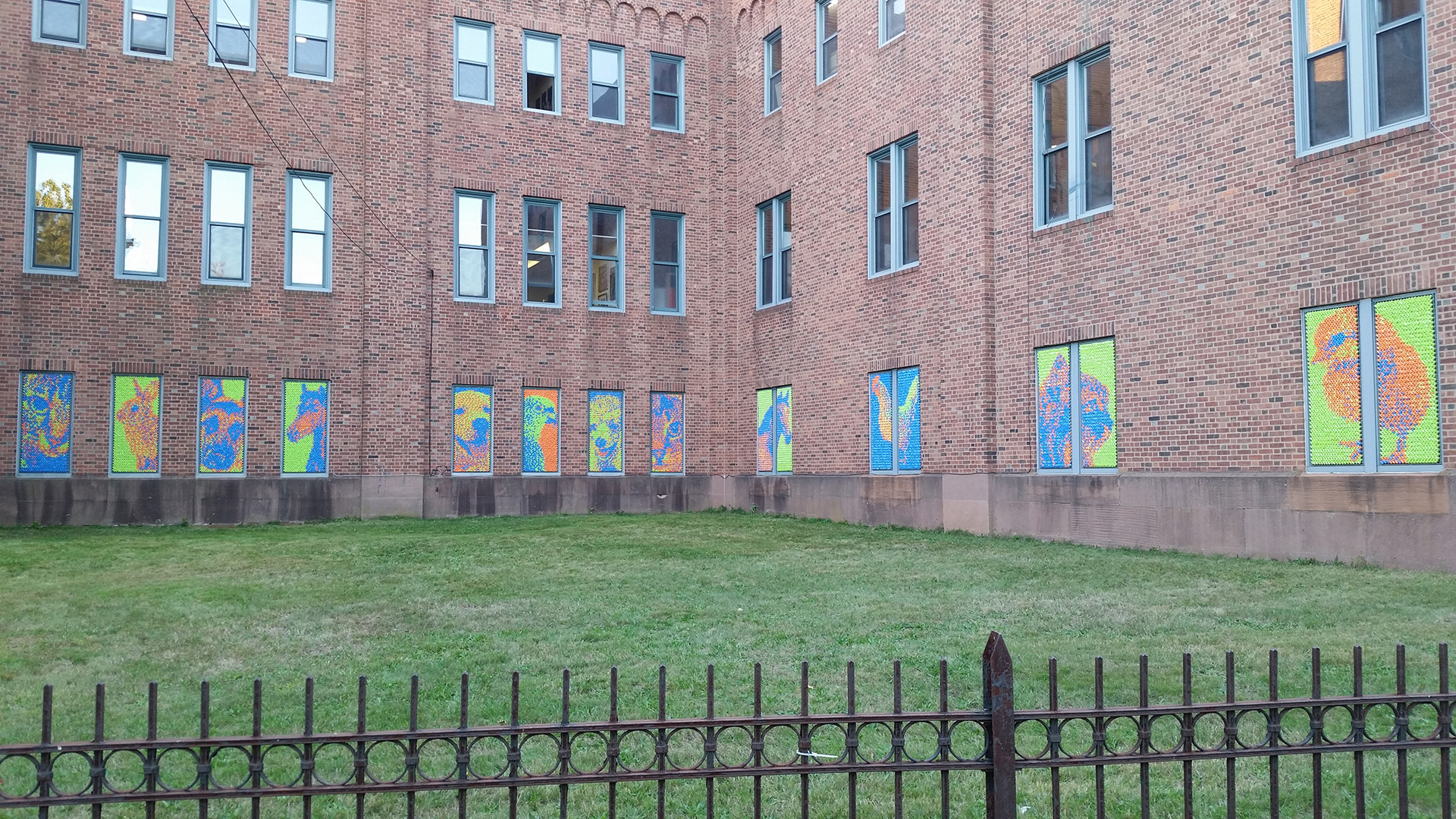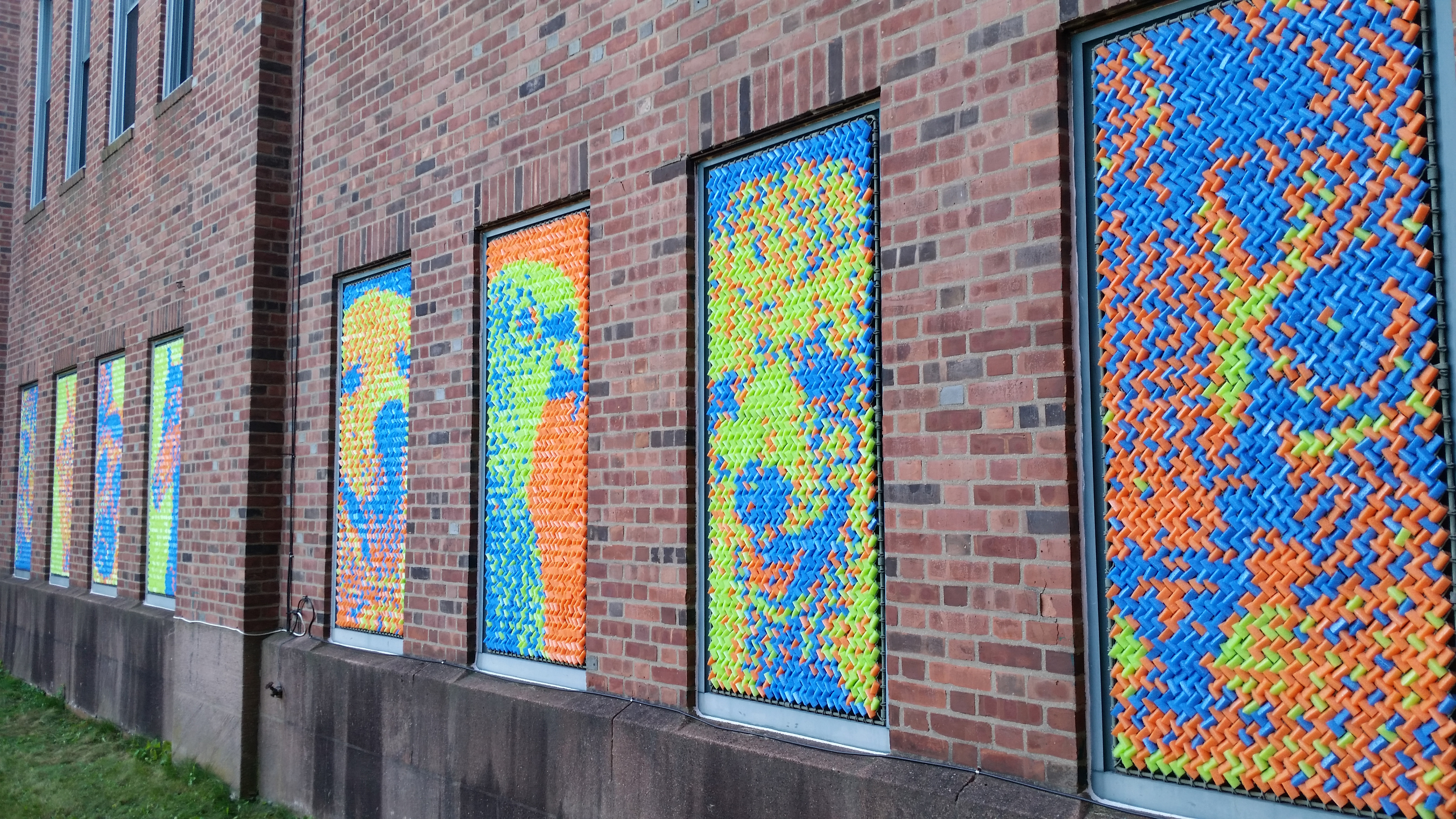 After our success with Marilyn, we went big for our next project: 25,352 pieces of pool noodles were installed on the windows of the Goffe Street Armory, as part of the City Wide Open Studios event. The theme for CWOS that year was "Dwelling," which we responded to by creating images of animals that have been domesticated.