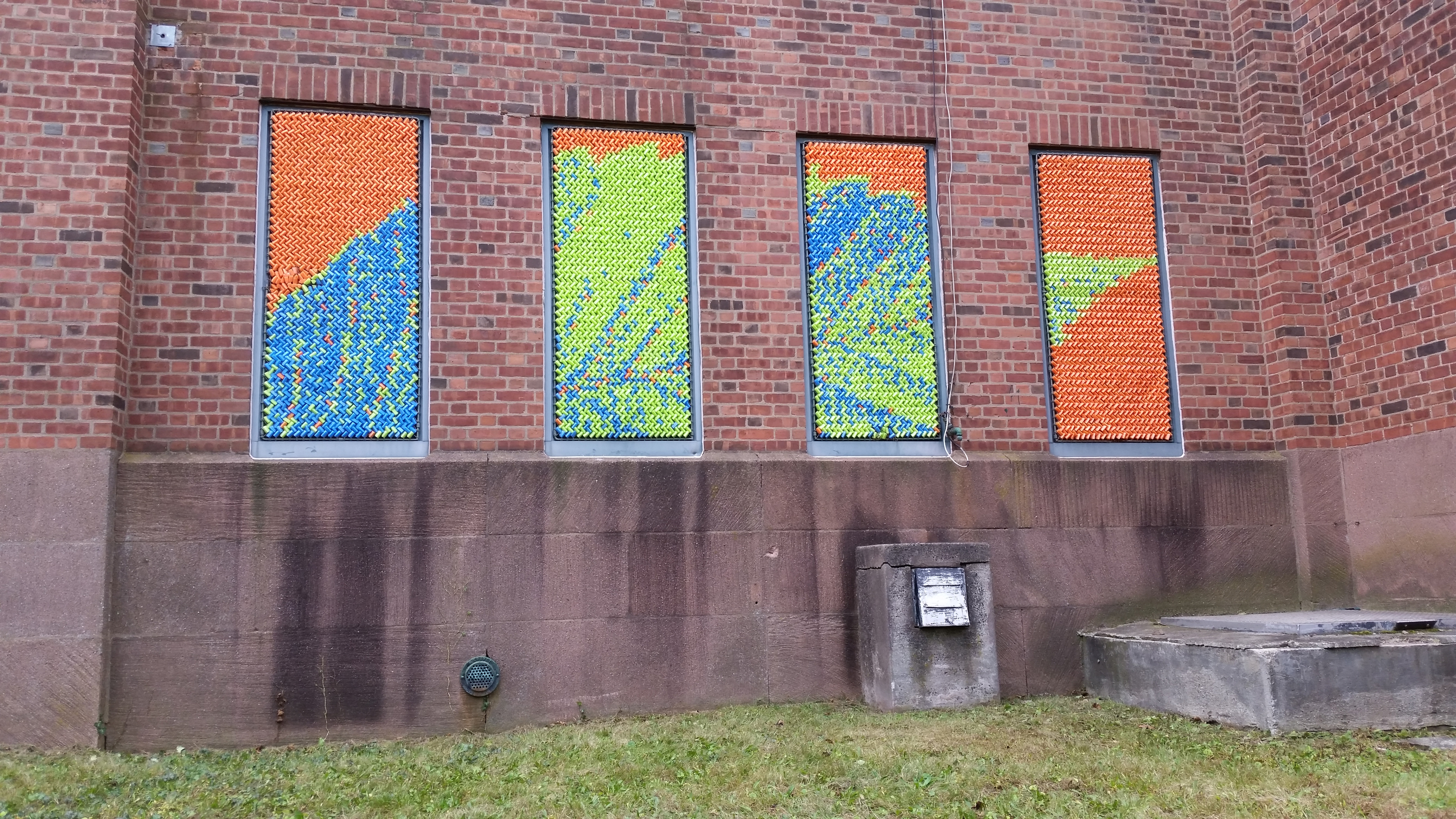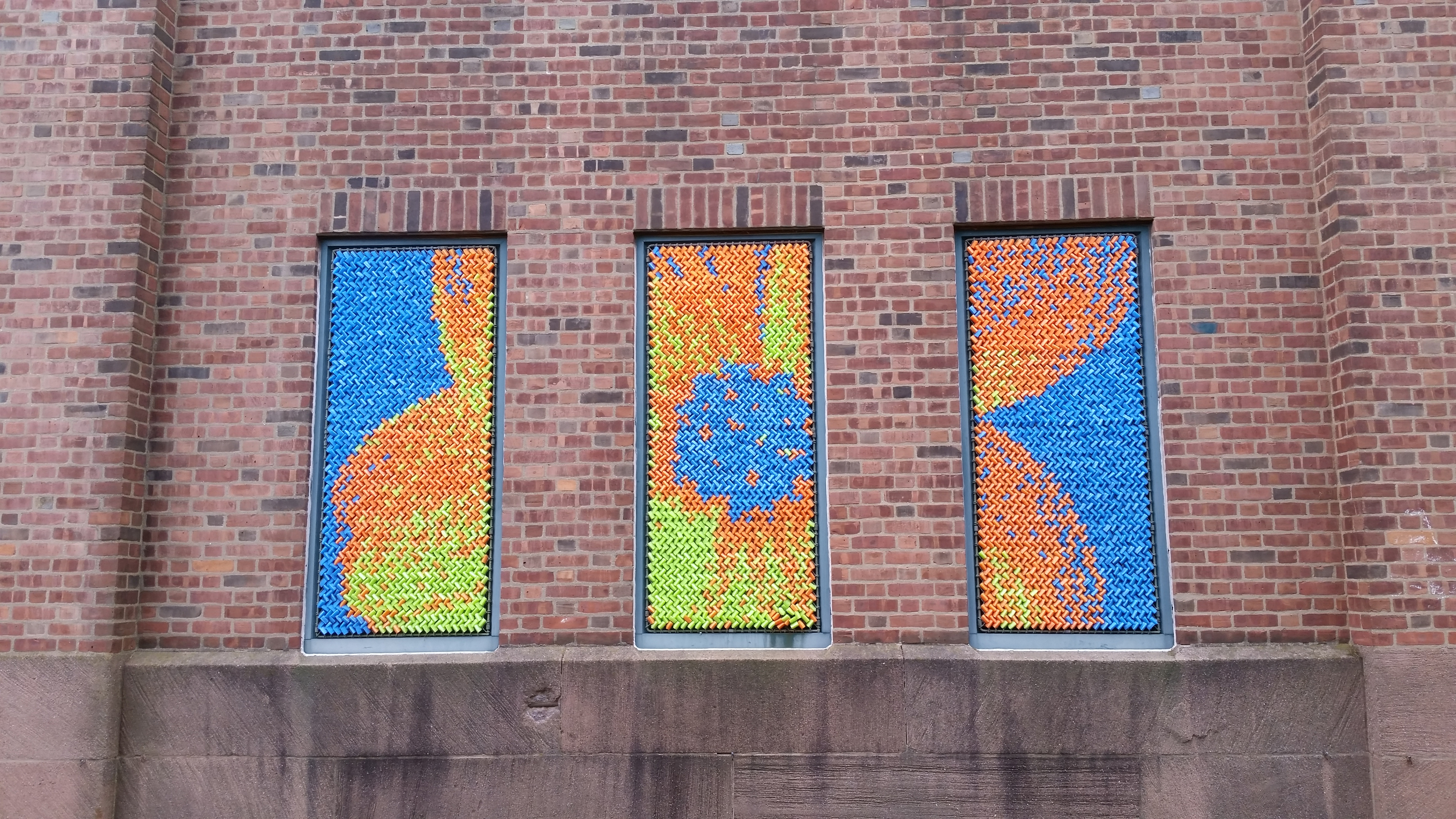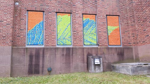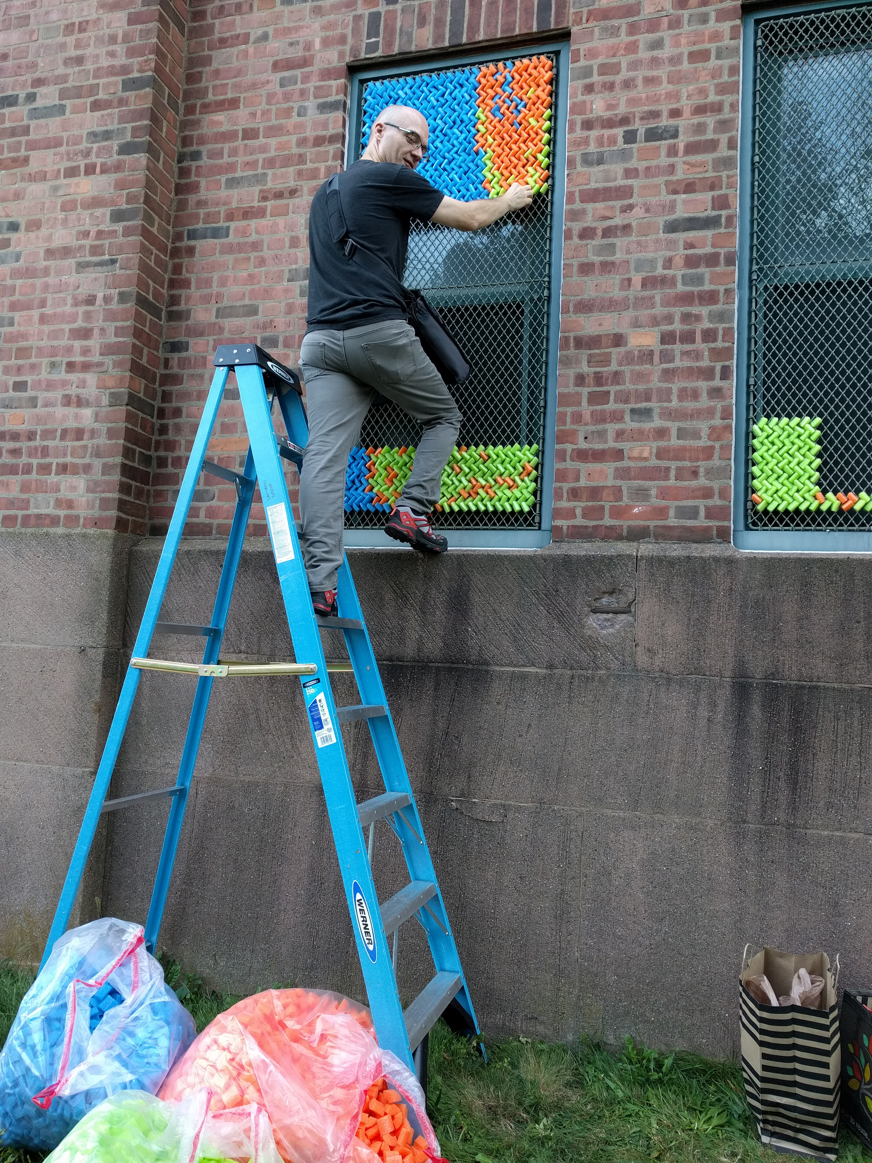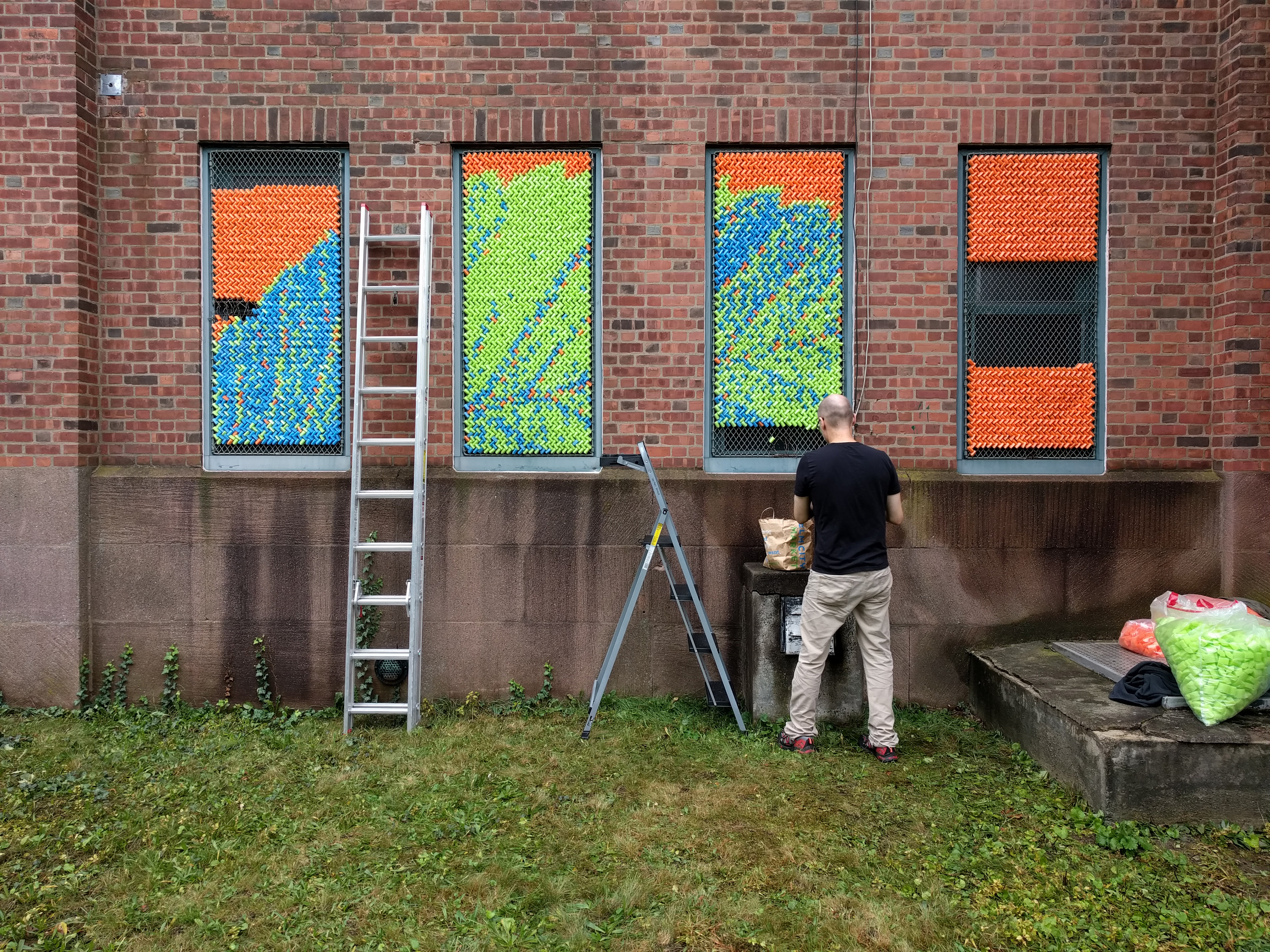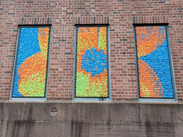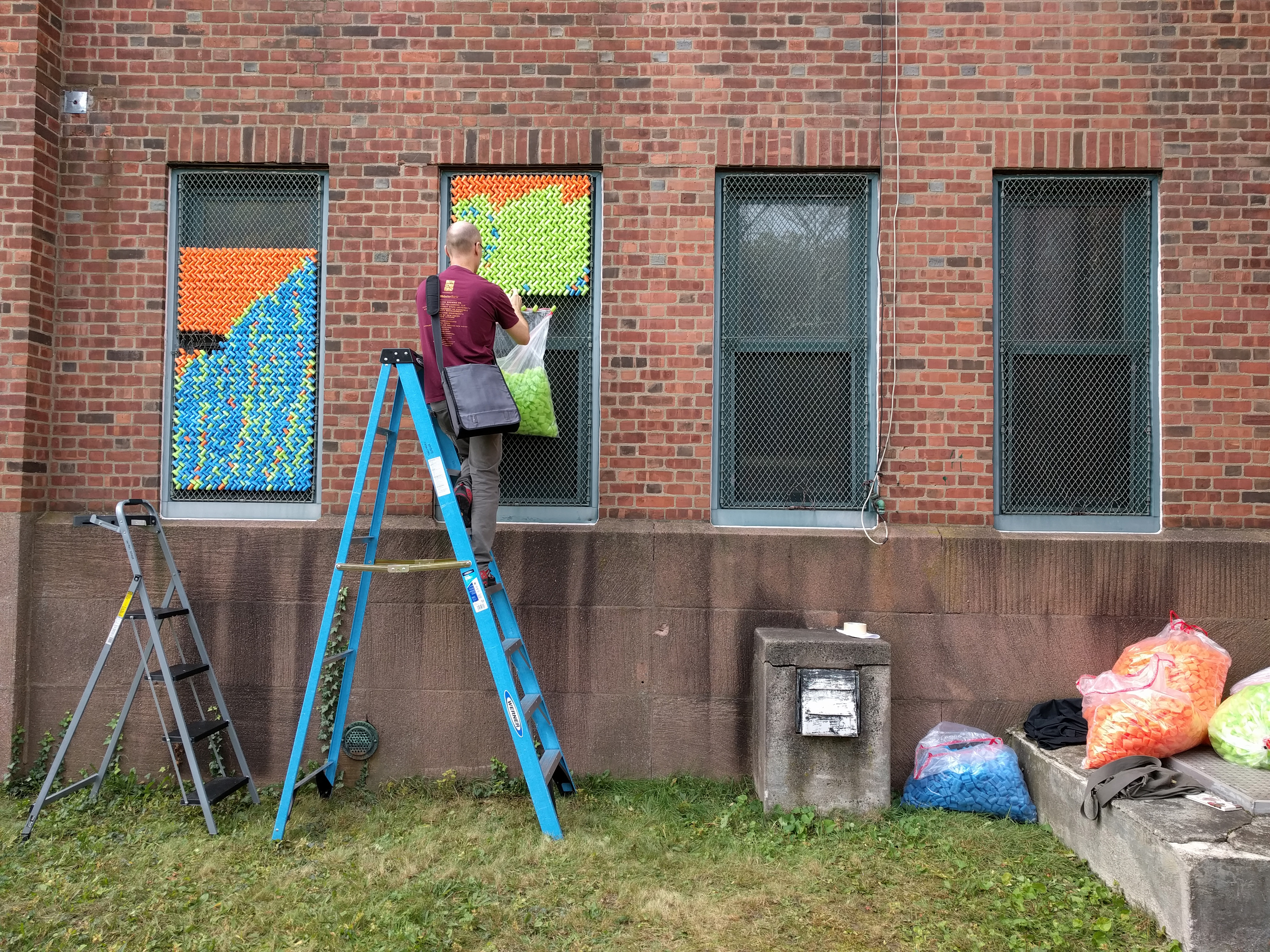 After our success with Marilyn, we went big for our next project: 25,352 pieces of pool noodles were installed on the windows of the Goffe Street Armory, as part of the City Wide Open Studios event. The theme for CWOS that year was "Dwelling," which we responded to by creating images of animals that have been domesticated.