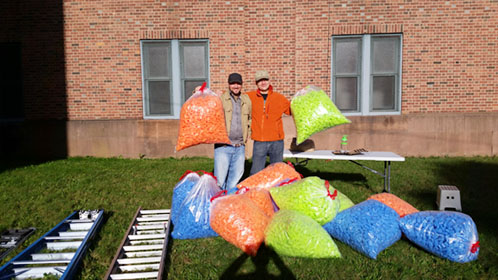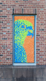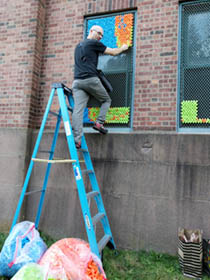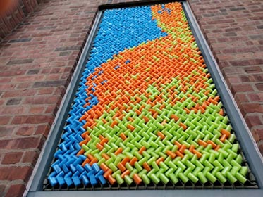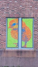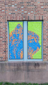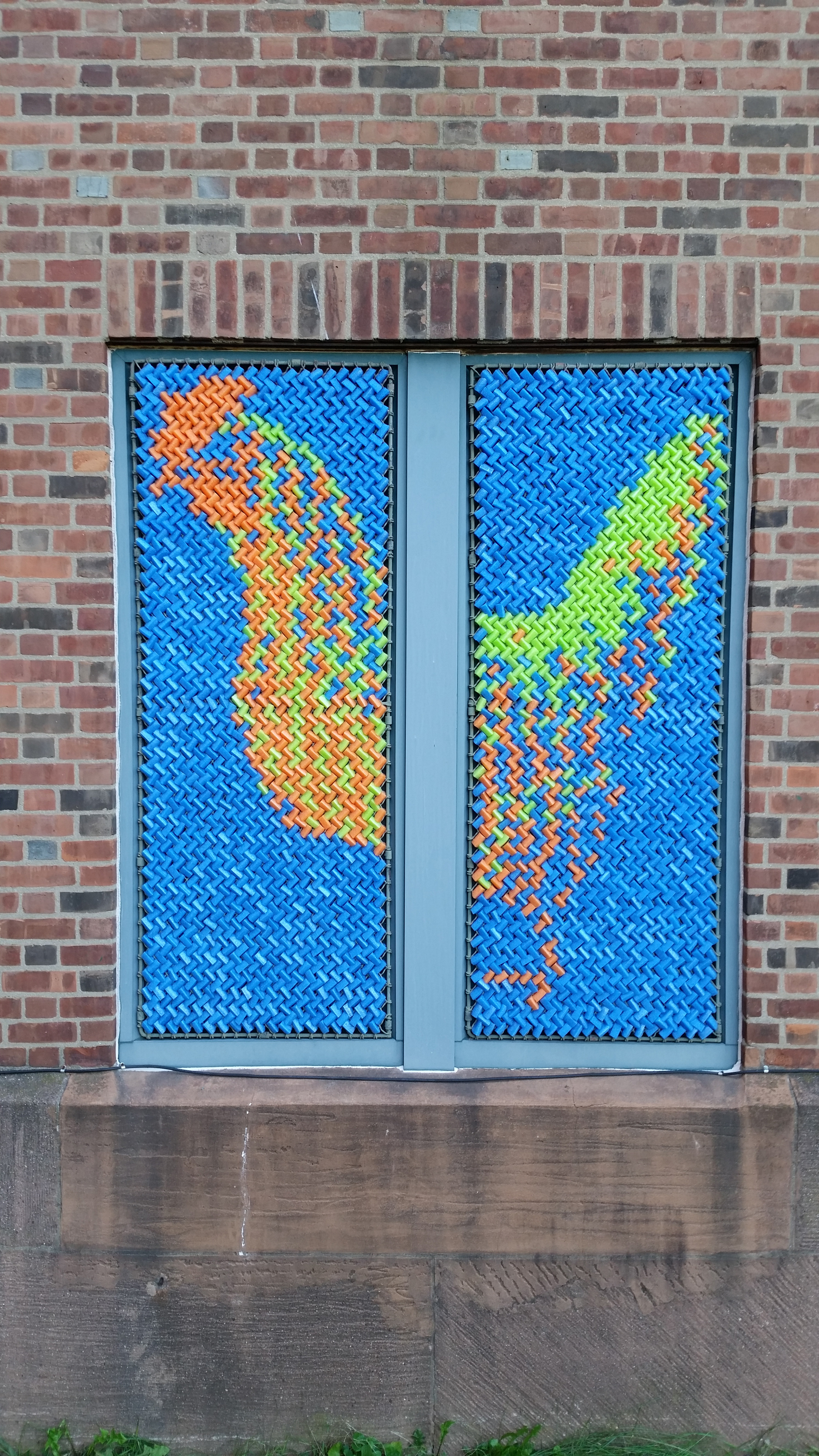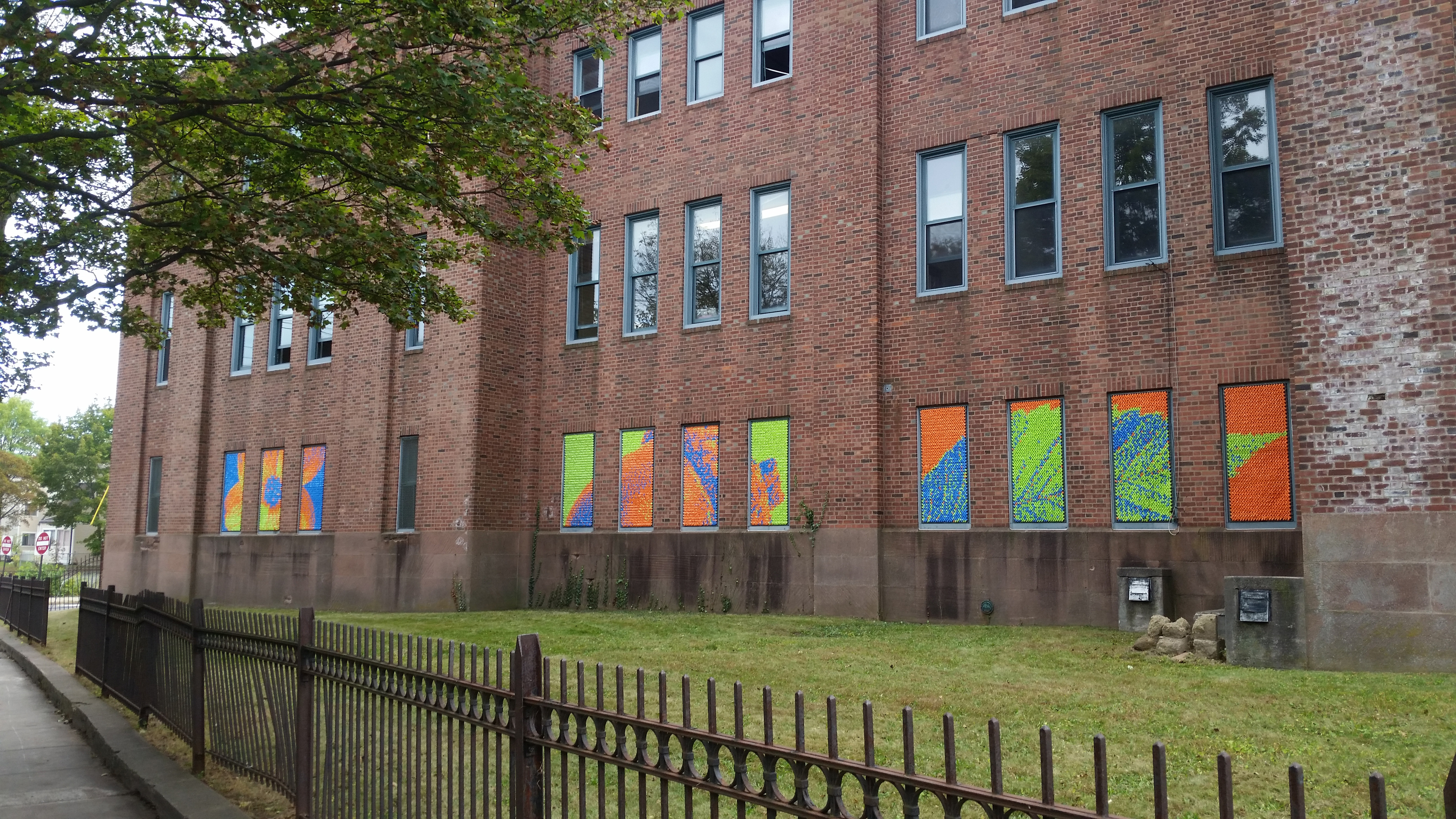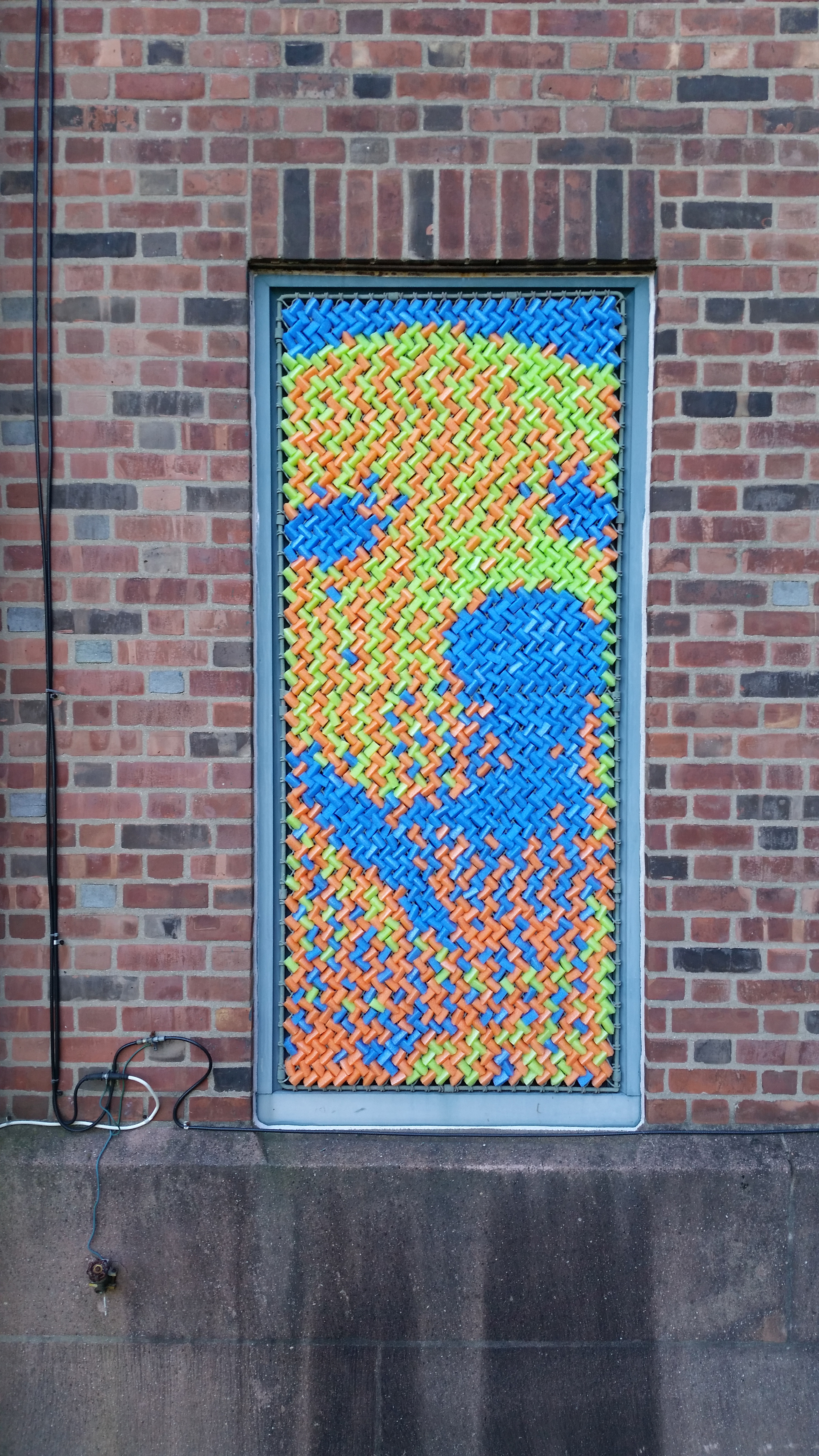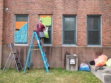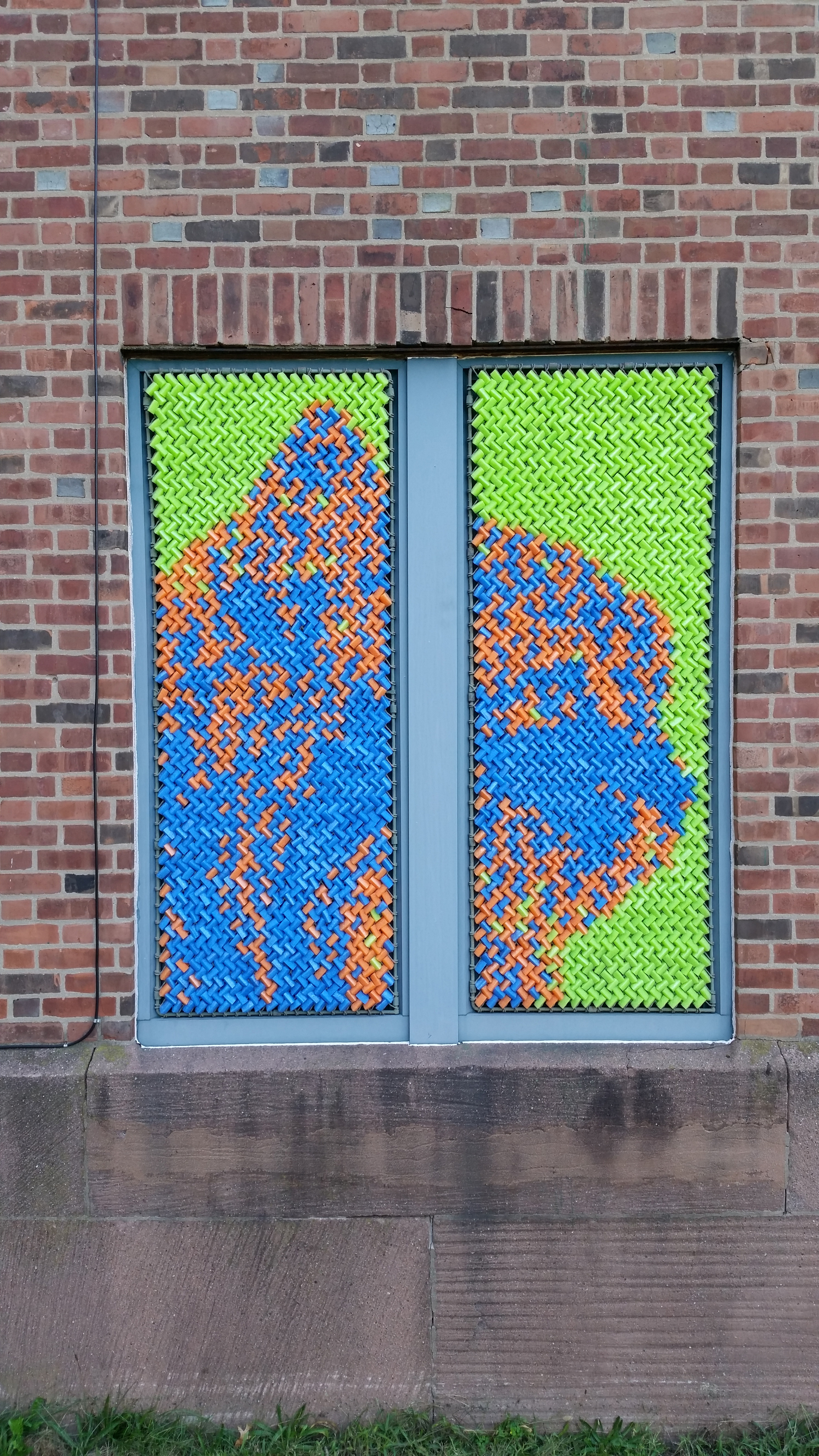 After our success with Marilyn, we went big for our next project: 25,352 pieces of pool noodles were installed on the windows of the Goffe Street Armory, as part of the City Wide Open Studios event. The theme for CWOS that year was "Dwelling," which we responded to by creating images of animals that have been domesticated.