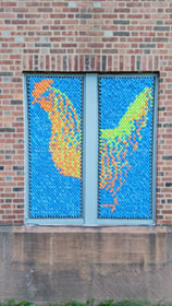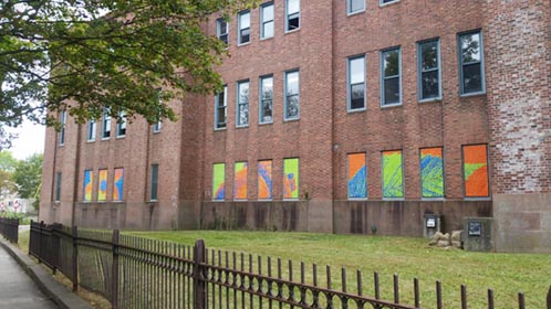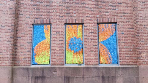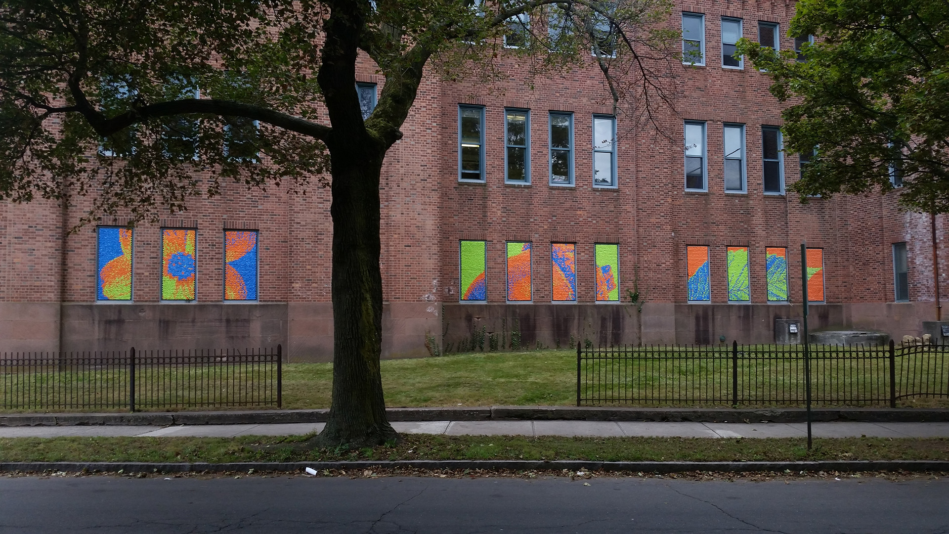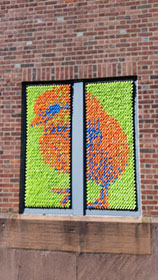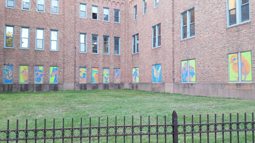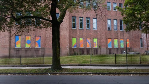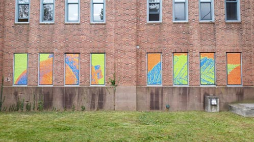 We again worked on windows of the Armory building in 2017, this time focusing on large images of botanical objects, spread out over multiple windows.